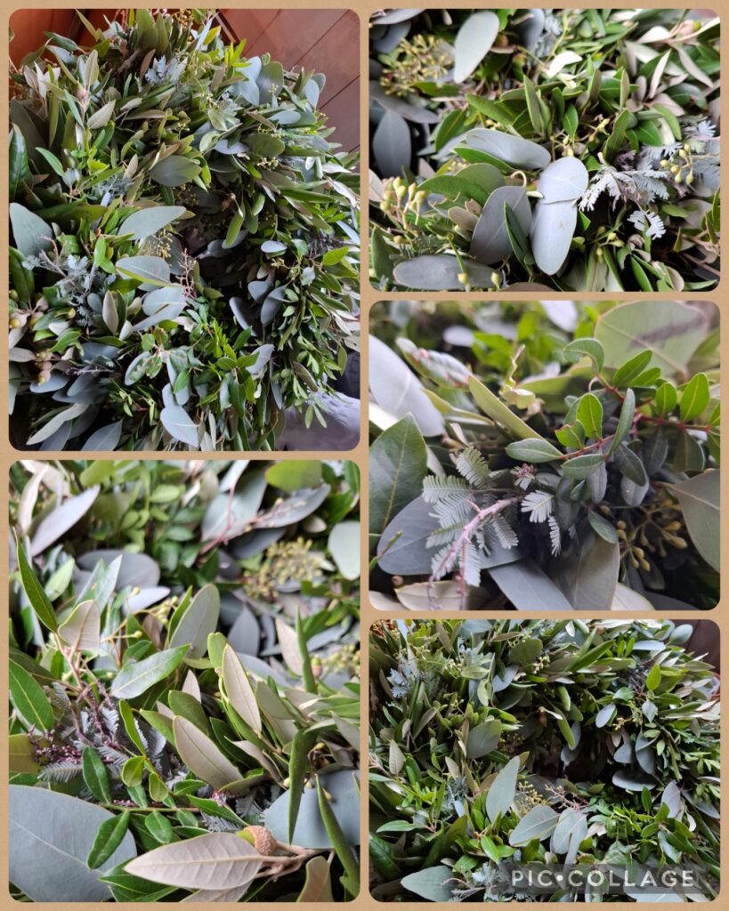 Mit Steineiche – Mimosen – Oliven – Eucalyptus und Pistatzienzweigen, binden wir auf einen 30cm grossen Strohrohling diesen wunderschönen grünen Winter Türkranz.